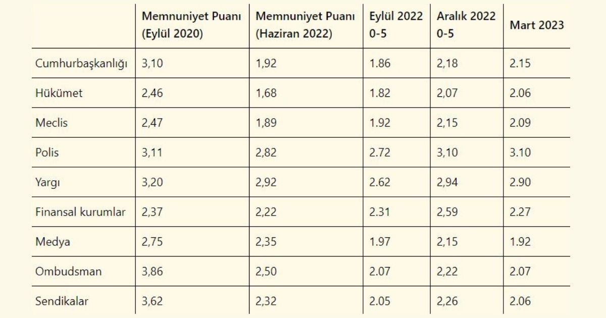 Ankete göre Cumhurbaşkanlığından memnuniyet 5 üzerinden 2.25 olurken, hükümetten memnuniyet 5 üzerinden 2.06 oldu.