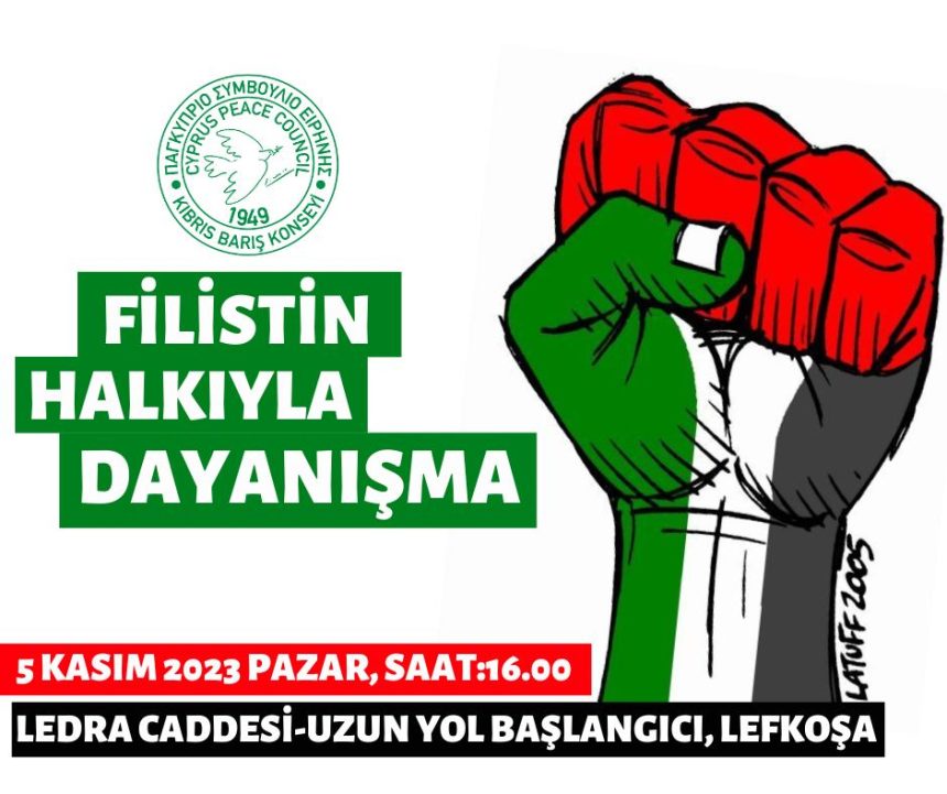 Kıbrıs Barış Konseyi derhal ateşkes talebinin güçlendirilmesi ve İsrail devletinin Gazze’deki zulmünün sona erdirilmesi için 5 Kasım 2023 Pazar günü saat 16.00’da düzenleyeceği Filistin Halkıyla Dayanışma etkinliğine katılmaları için tüm barışseverlere ve örgütlere çağrıda bulundu.