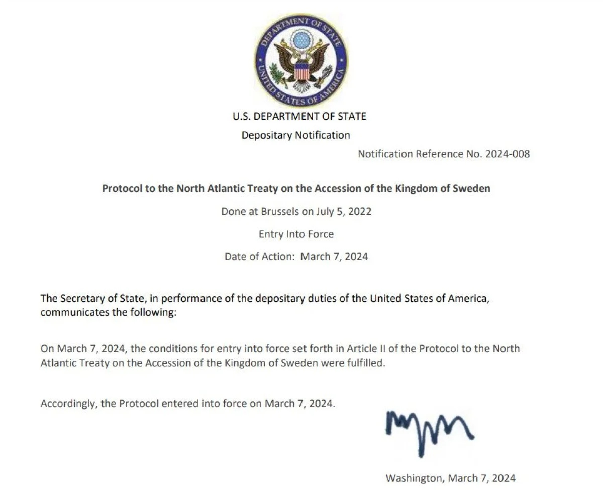 ”7 Mart 2024 tarihinde İsveç Krallığı’nın Katılımına İlişkin Kuzey Atlantik Antlaşması Protokolünün 2. Maddesinde belirtilen yürürlüğe girme koşulları yerine getirildi.”