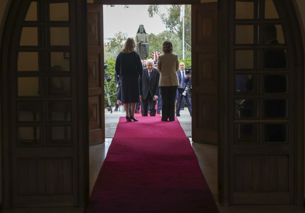 İtalya Cumhurbaşkanı, Nikos Hristodoulidis ve eşi First Lady Filippa Karsera-Hristodoulidis tarafından Cumhurbaşkanlığı sarayında karşılandı.