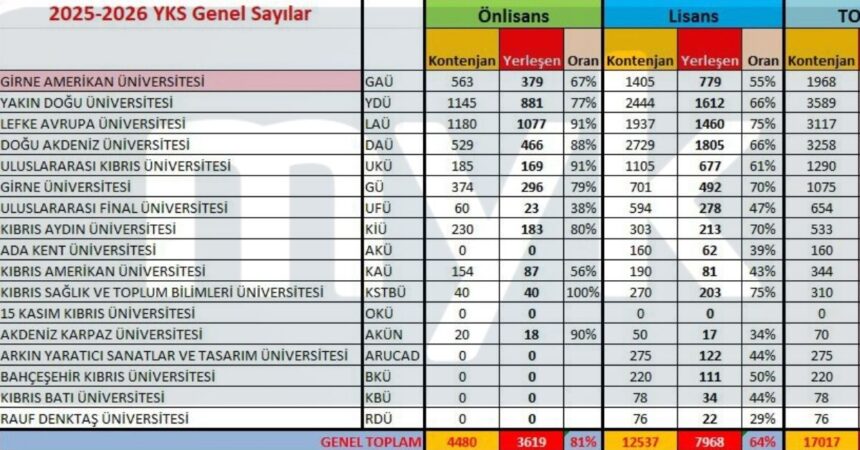 KKTC üniversitelerinde 2025 yılı yerleşme sonuçları açıklandı. Toplam 17 bin 17 kontenjanın 11 bin 587’si dolarken, ön lisans programlarında doluluk oranı yüzde 81, lisans programlarında ise yüzde 64 oldu. Lefke Avrupa Üniversitesi ve Kıbrıs Sağlık ve Toplum Bilimleri Üniversitesi ön lisans programlarında tam doluluk sağlarken, lisans programlarında bazı özel üniversitelerde doluluk oranları yüzde 30’lara kadar düştü.