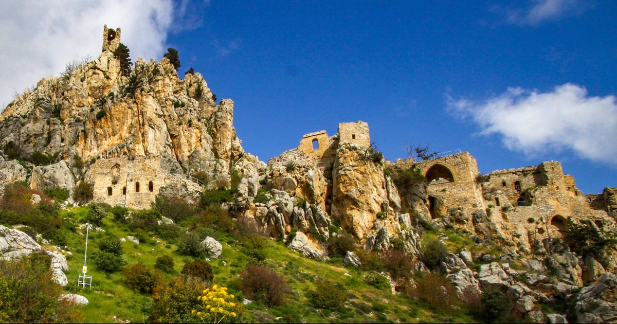 Beşparmak sıradağlarının yükseklerinde konumlanmış St. Hilarion Kalesi, batıya ve doğuya doğru uzanan kıyı şeridinin nefes kesen manzarasını ve Girne’yi tepeden seyreder.