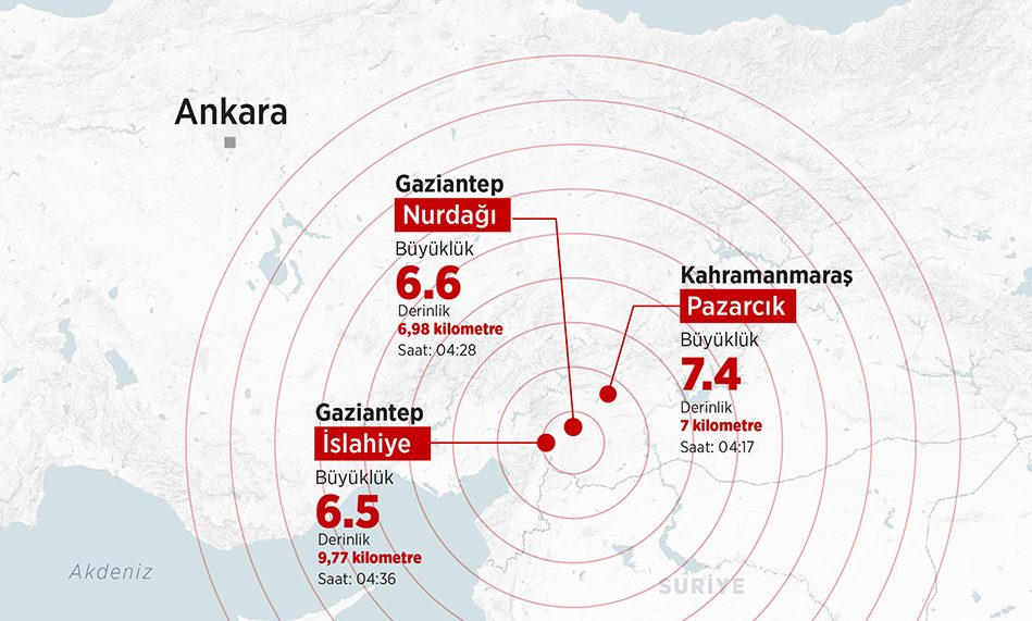 Kahramanmaraş’ın Pazarcık ilçesinde saat 4.17’de 7,4 büyüklüğünde deprem olurken Gaziantep’te de büyüklükleri 6,4 ile 6,5 olan iki deprem meydana geldi.